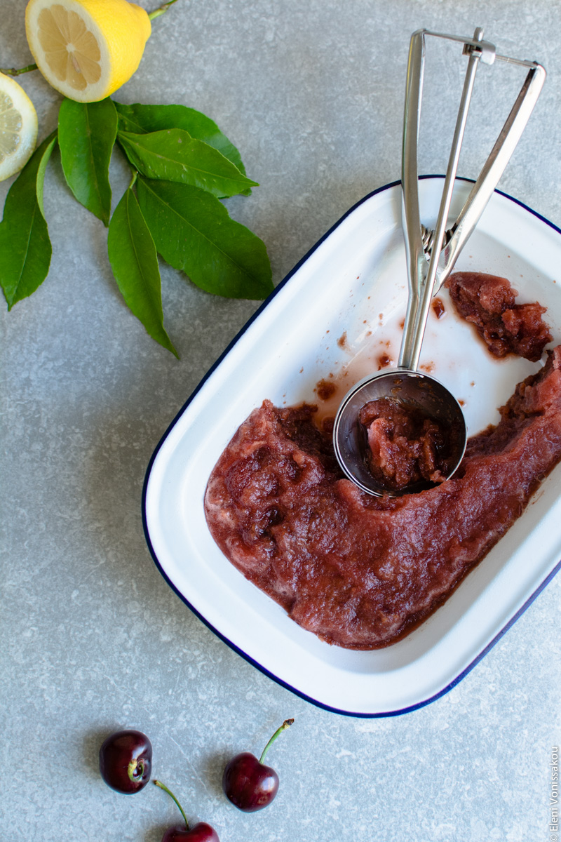 Next comes a granita (sorbet) made with cherries and the incredibly fragrant mastic liqueur that is really popular here in Greece (mastic – a tree resin – can only be produced in one specific area of Greece, the island of Chios!). Find the liqueur online and keep it in the freezer for a delicious digestif. Or make lots of this granita with it!