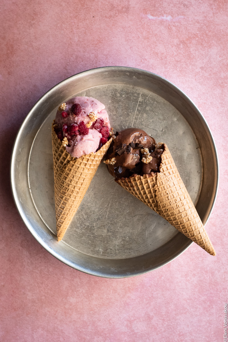 Εδώ έφτιαξα δυο εκδοχές, μια με cacao (αν αναρωτιέστε γιατί το γράφω με αγγλικούς χαρακτήρες δείτε αυτό το άρθρο μου) και μια με σμέουρα (γνωστά και ως φραμπουάζ). Συνολικά έχουμε τέσσερα μόνο υλικά, και ενώ υπάρχει φυσικά μια αναμονή για την ψύξη, γενικά η συνταγή γίνεται εύκολα και γρήγορα. Μερικές ακόμα ιδέες για άλλες γεύσεις είναι το μάνγκο, το ροδάκινο, ο ανανάς, και έχω δει να φτιάχνουν τέτοιο παγωτό με βούτυρα ξηρών καρπών. Θα δοκιμάσω σίγουρα με φυστικοβούτυρο!